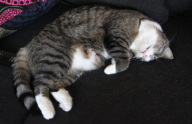 Kesäkuukaudet tuntuvat olevan Paavolle joka vuosi yhtä hankalia. Hirmuisesti tuskastuttaa kuumuus joka pilvisinäkin päivinä tunkeutuu pohjavilloihin saakka ja saa Paavon sähisemään viereen yrittäville täplakissoille. Paavo nukkuu paljon yksin ja pyrkii tuulettelemaan kehoaan monin eri tavoin..valitettavasti myös viimekesän oksentelut ovat palanneet kuvioihin. Onneksi vähenivät pian niiden muutaman lämpöisemmän viikon jälkeen.